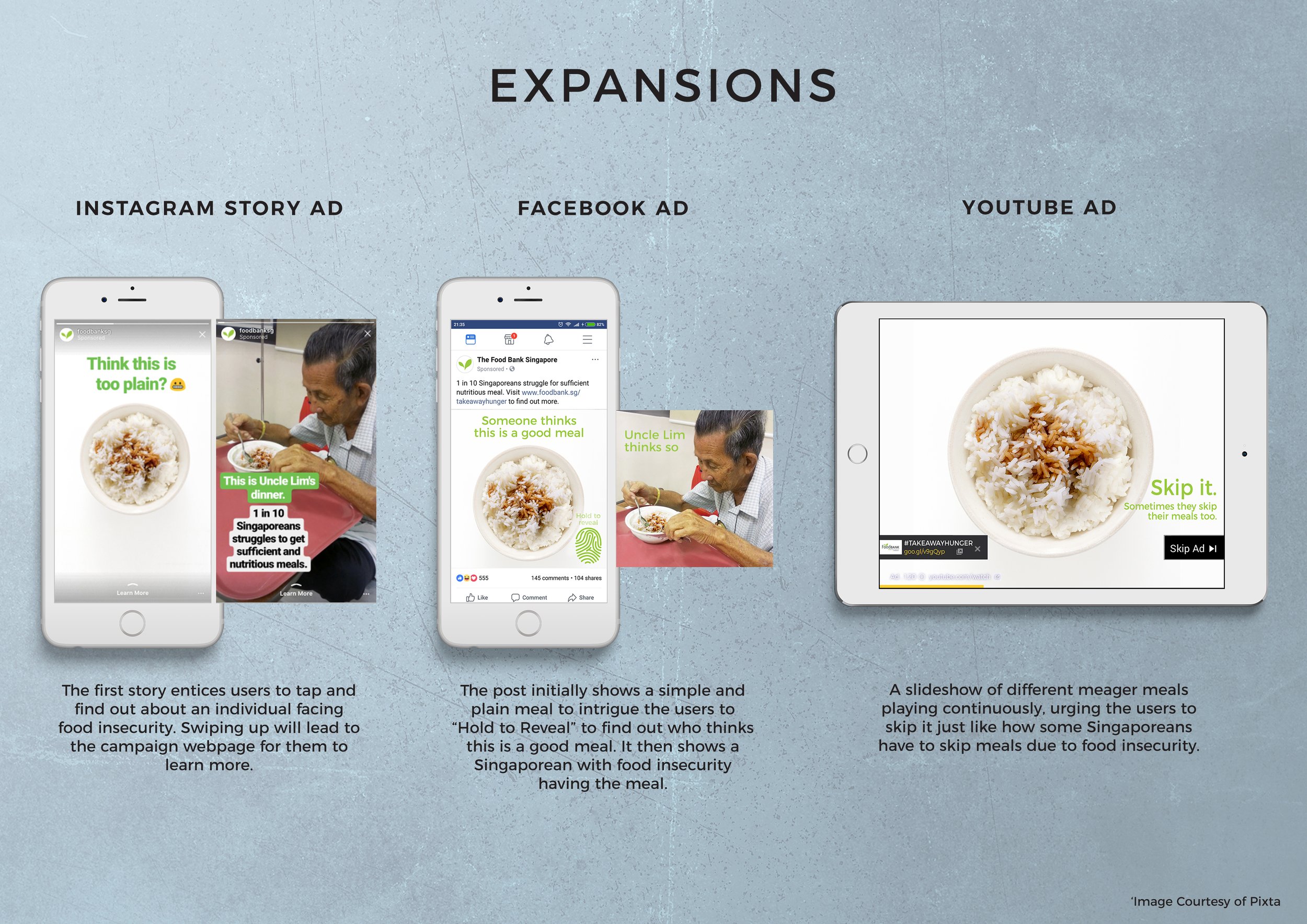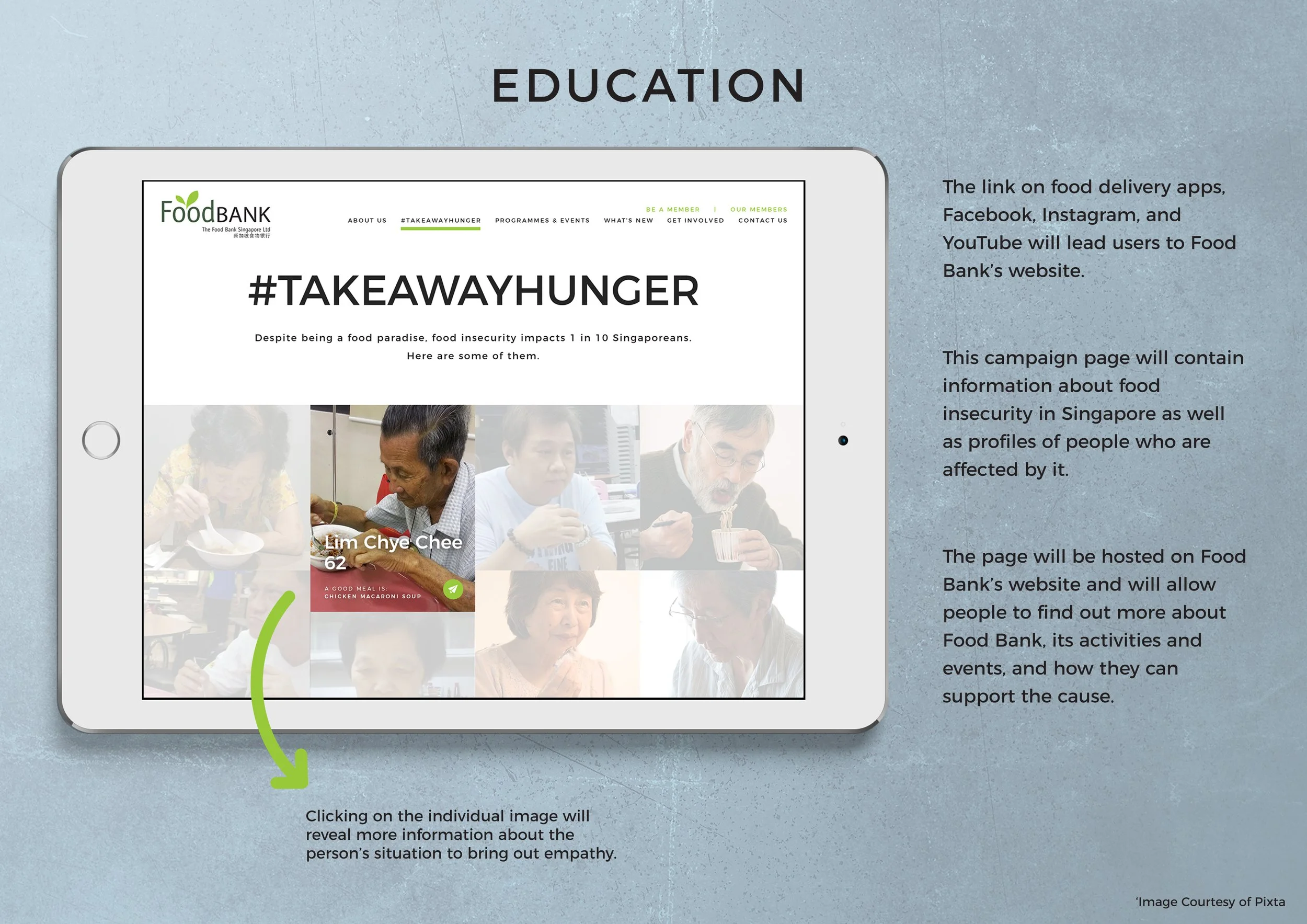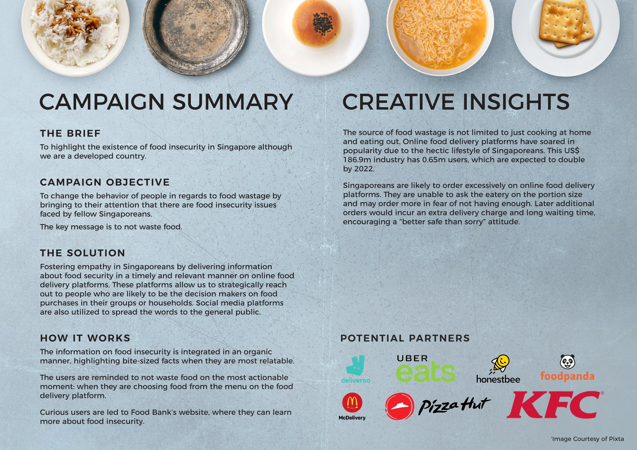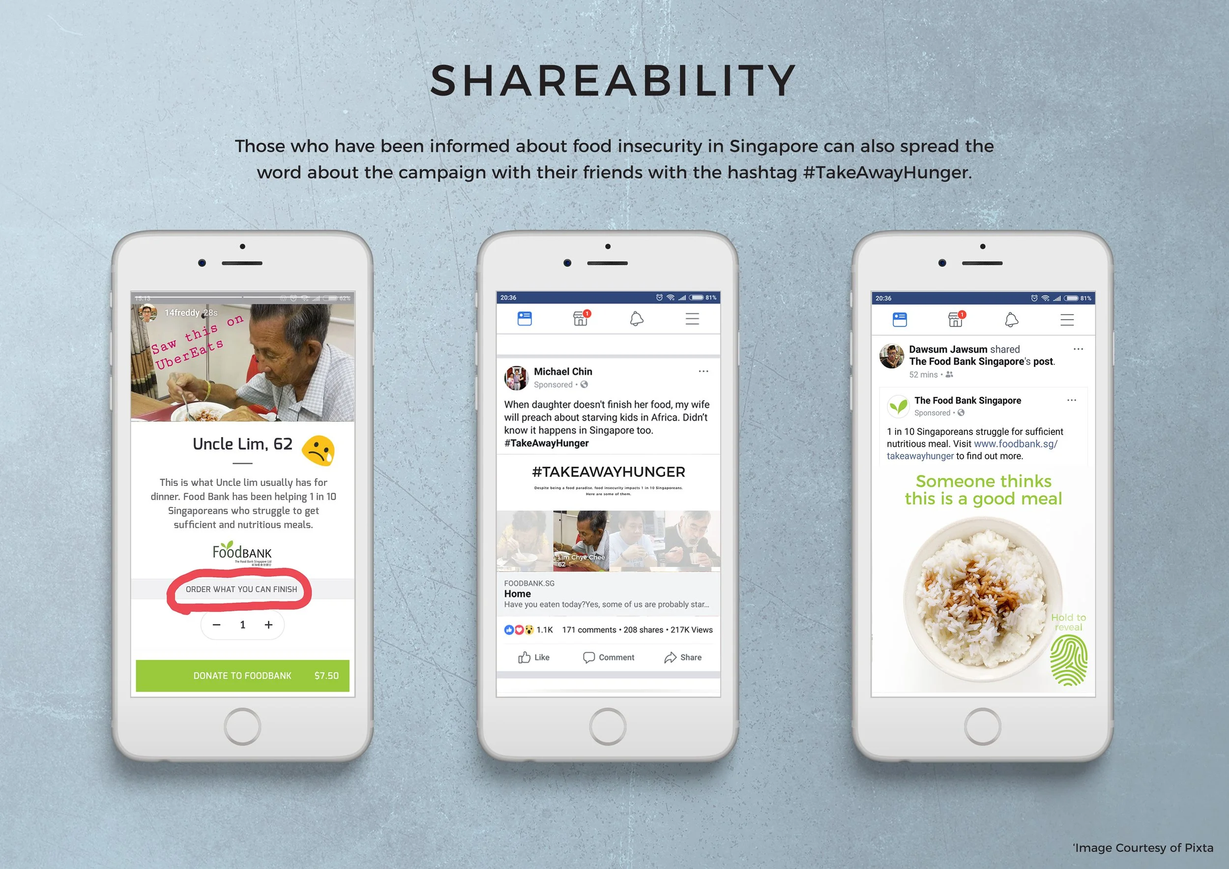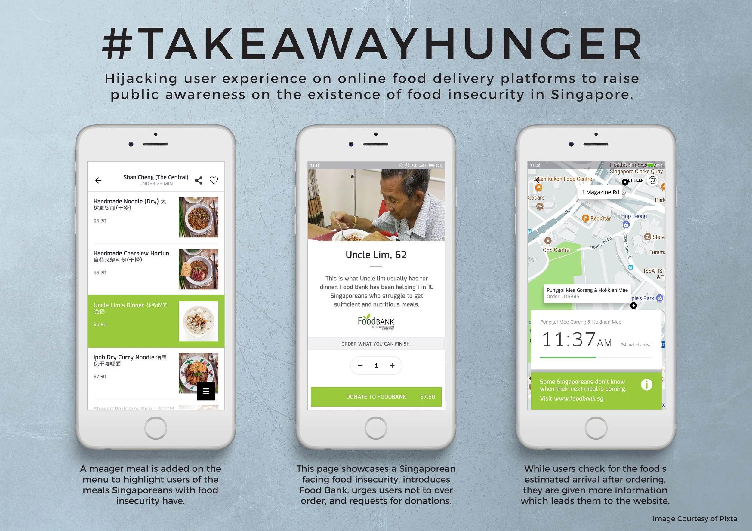 In partnership with Food Bank Singapore, #TAKEAWAYHUNGER aimed to raise public awareness on the existence of food insecurity in Singapore by hijacking user experience on online food delivery platforms. It leverages on many Singaporean’s existing lifestyle behaviors of ordering food deliveries to highlight the pressing issue of food wastage and foster empathy within them.